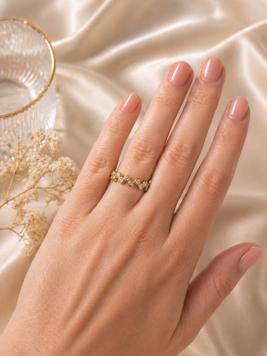Elegant en verfijnd, de Celeste Spark Ring vangt het licht bij elke beweging. De subtiele steentjes zorgen voor een zachte, luxe uitstraling zonder te overheersen. Perfect voor dagelijks gebruik of om te combineren met andere ringen voor een layered look.